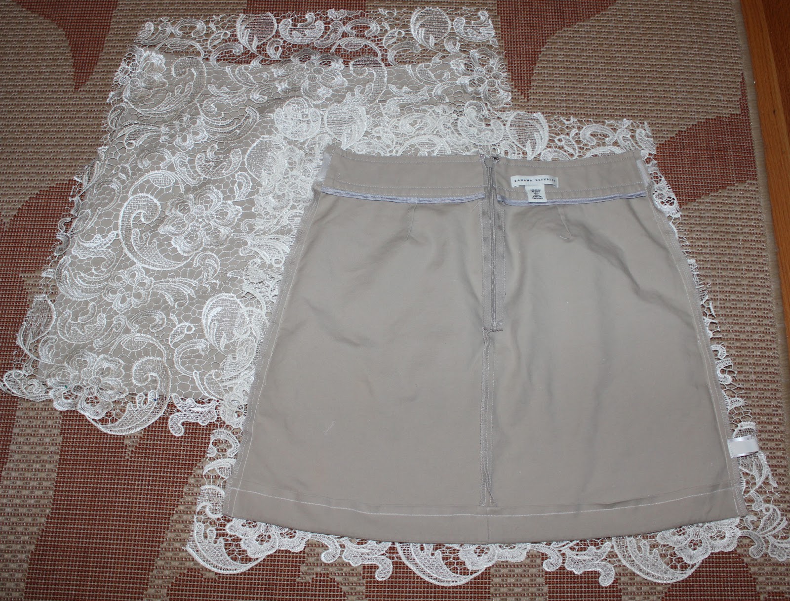| You'll need an old skirt, lace fabric, scissor, seam ripper, pins, ruler |